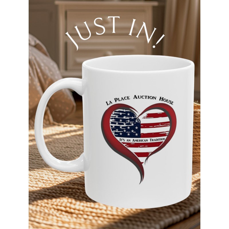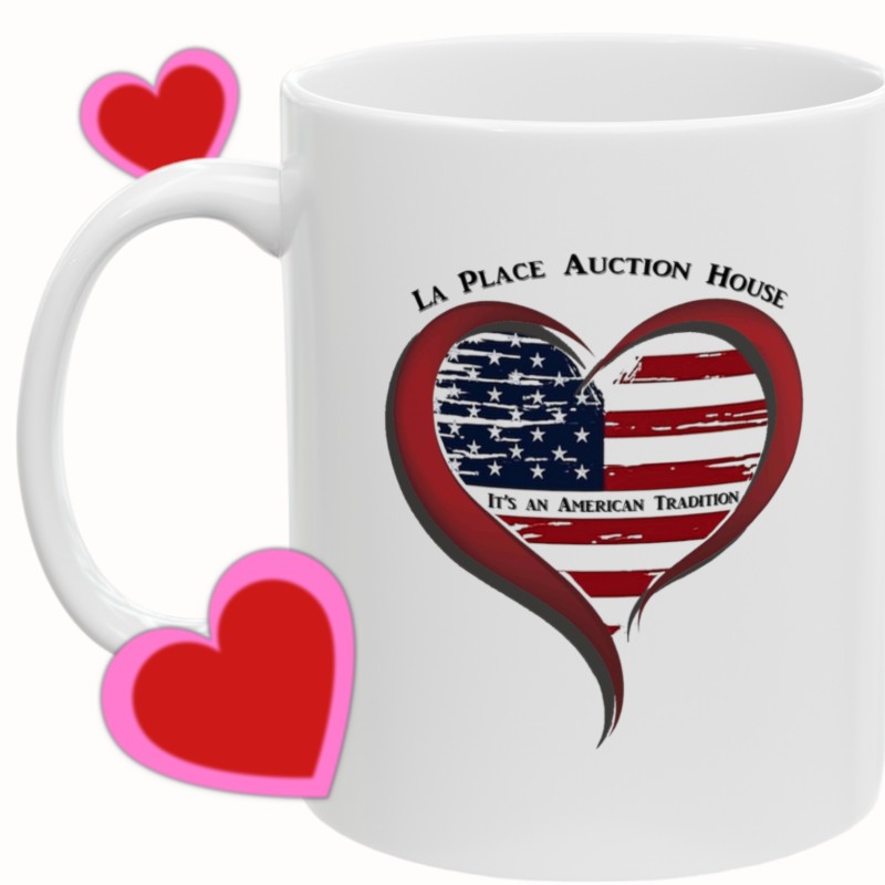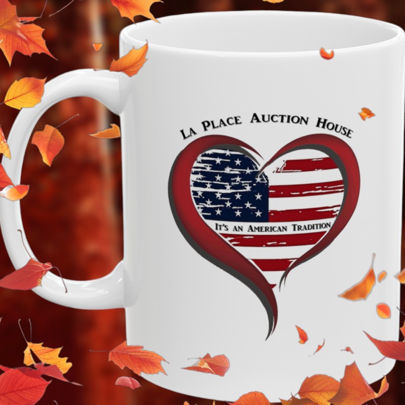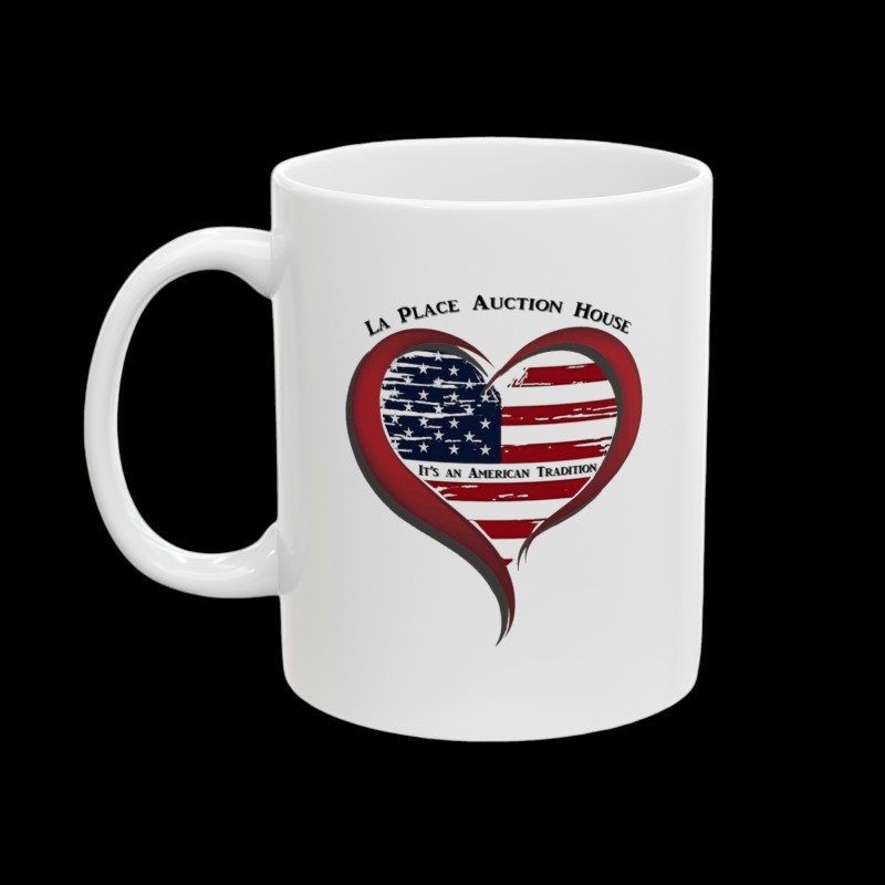Warm-up with a nice cuppa out of this white ceramic coffee mug. Decorated with our very own "An American Tradition" Design showing our support for the love of auctions and La Place Auction House. It’s BPA and Lead-free, microwave & dishwasher-safe, and made of white, durable ceramic in an 11-ounce size. The perfect gift for coffee, tea, and hot chocolate lovers.