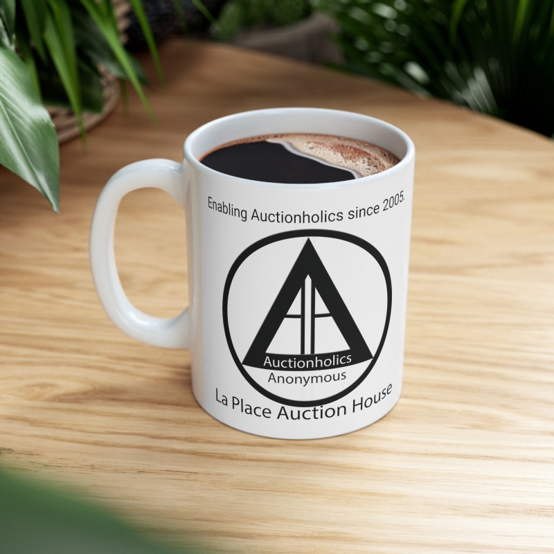 11 oz. White Mug with Auctionholics Anonymous La Place Auction House Logo