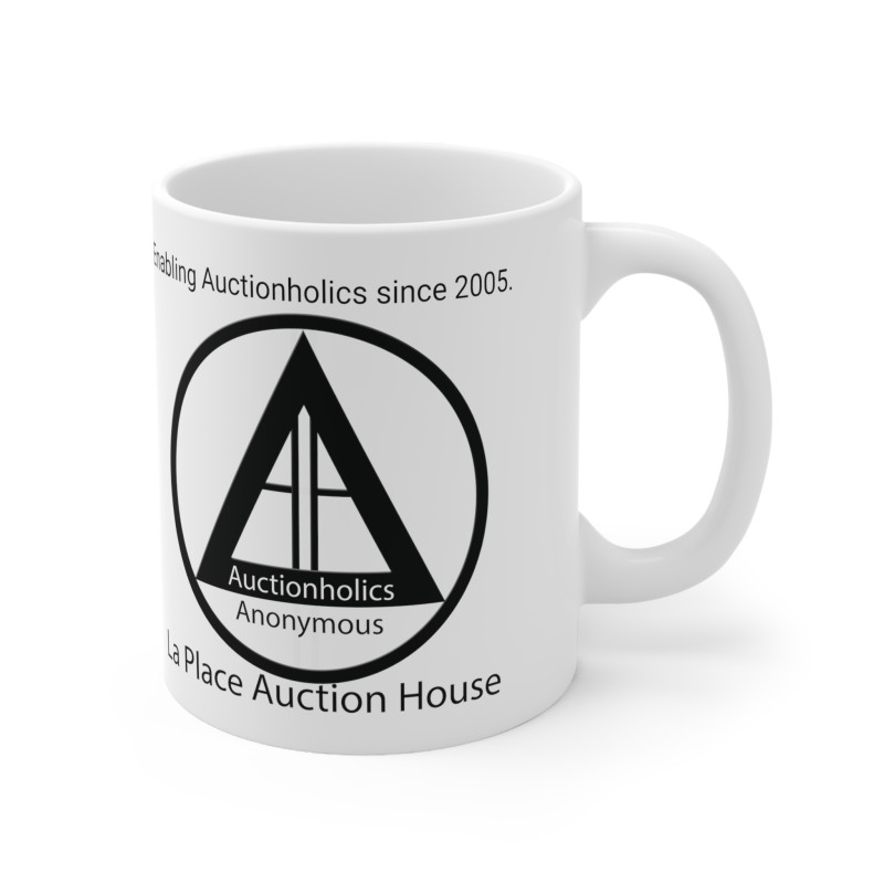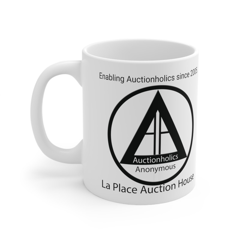 Warm-up with a nice cuppa out of this white ceramic coffee mug. Decorated with our very own Auctionholics Anonymous logo showing our support for the love of auctions and La Place Auction House. It’s BPA and Lead-free, microwave & dishwasher-safe, and made of white, durable ceramic in an 11-ounce size. The perfect gift for coffee, tea, and hot chocolate lovers.