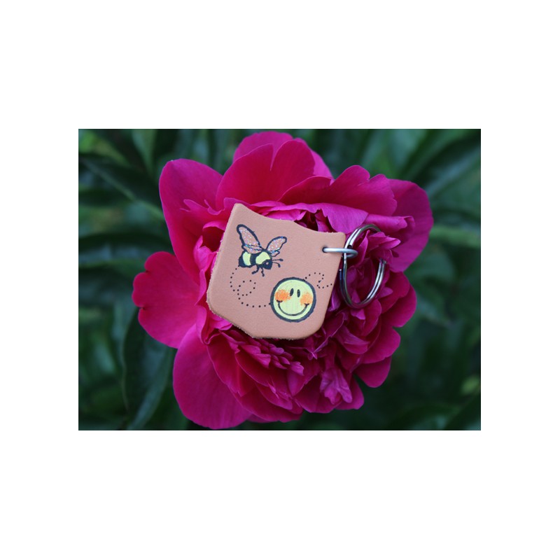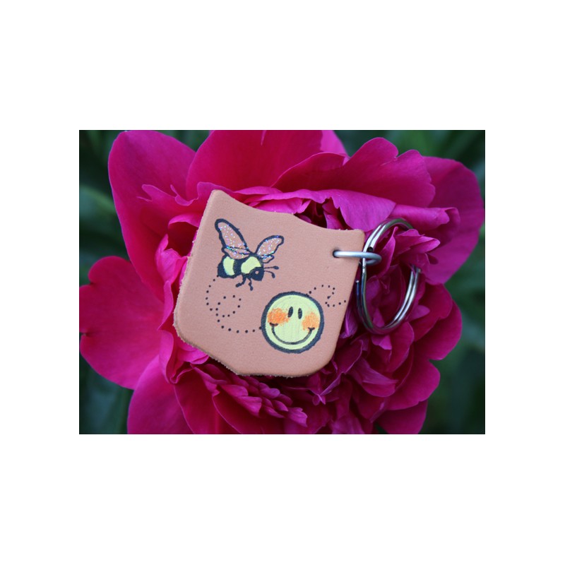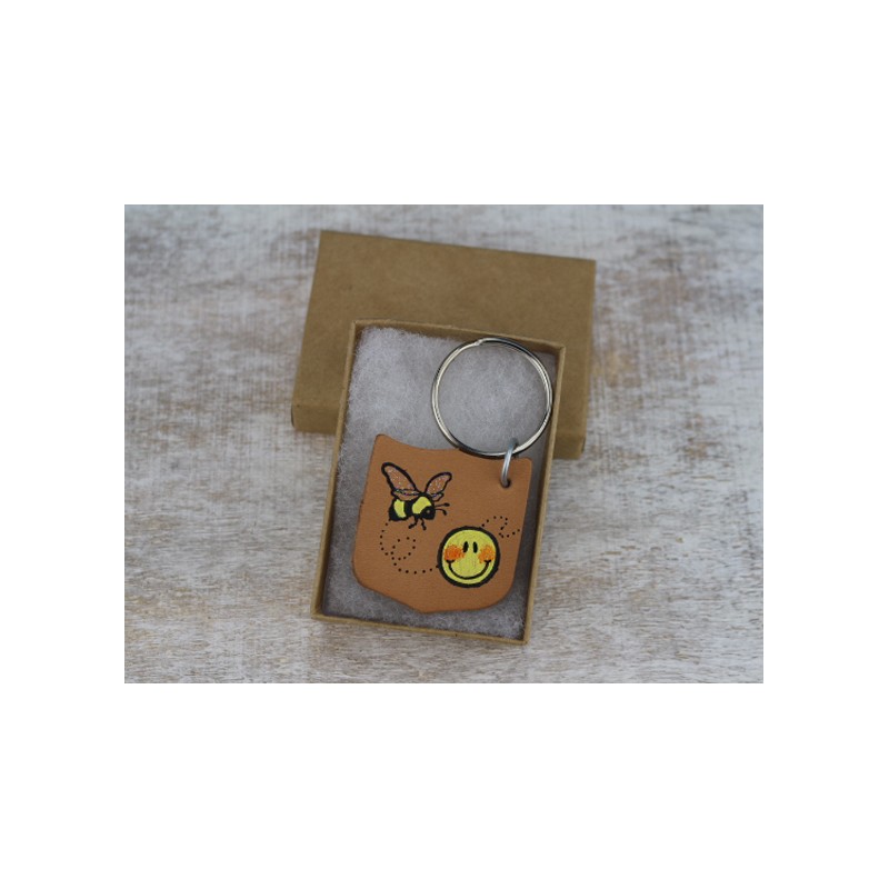 This is a 100% genuine leather key fob with a hand-painted "Bee Happy". The smiley face is yellow with orange cheeks and the bee's wings sparkle.